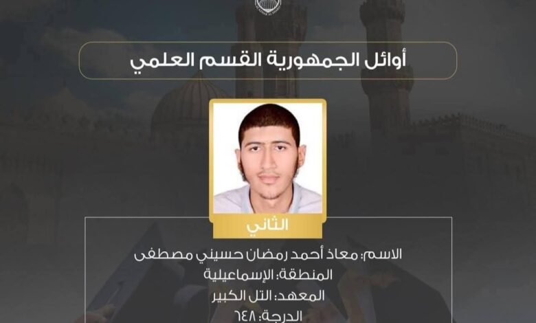 هنأ اللواء أكرم محمد جلال محافظ الإسماعيلية، الطالب معاذ أحمد رمضان حسيني مصطفى، معهد التل الكبير منطقة الإسماعيلية الأزهرية؛ لحصوله على المركز الثاني على مستوى الجمهورية بالقسم العلمي للعام الدراسي ٢٠٢٤/ ٢٠٢٥ بمجموع درجات ٦٤٨ درجة بنسبة مئوية ٩٩.٦٩٪.