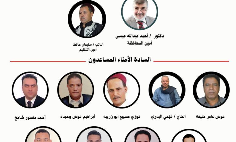 وتقرر تعيين الدكتور أحمد عبدالله عيسى أمينًا لمحافظة مطروح، وتكليف النائب سليمان حافظ بمنصب أمين التنظيم، ضمن التشكيل القيادي للأمانة.