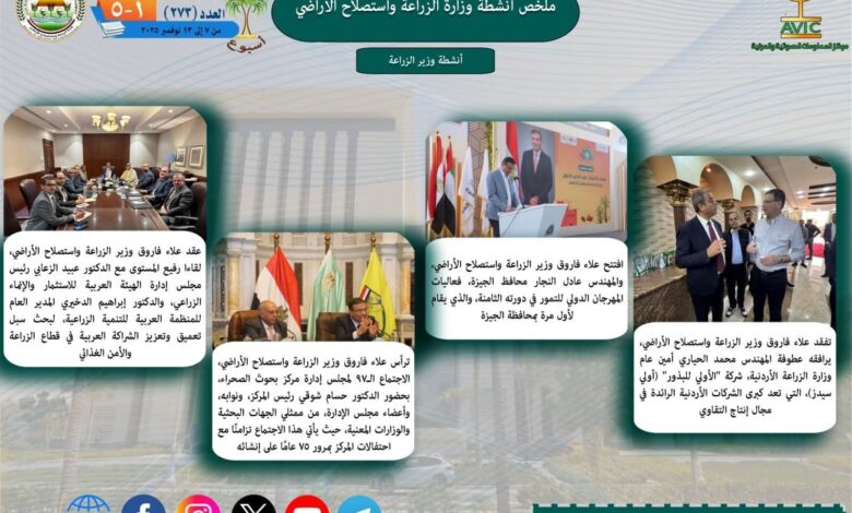 وأطلقت وزارة الزراعة واستصلاح الأراضي، خلال هذا الاسبوع، أولى “قوافل التنمية الزراعية الشاملة” من مركز العدوة محافظة المنيا، تحت رعاية علاء فاروق وزير الزراعة واستصلاح الأراضي، واللواء عماد كدواني، محافظ المنيا، تحت شعار “معاك في الغيط.. معًا نحصد الخير، كما نظمت الوزارة، أكثر من 2300 نشاط إرشادي متنوع لدعم أكثر من 61 ألف مزارع خلال اكتوبر ضمن مبادرة “البحوث الزراعية” لتفعيل المراكز الإرشادية، كما شهدت الوزارة، اجتماعا تنسيقيا موسعا، تنفيذا لتكليفات علاء فاروق وزير الزراعة واستصلاح الأراضي، بهدف توحيد الجهود الإرشادية بكافة الجهات المعنية التابعة للوزارة